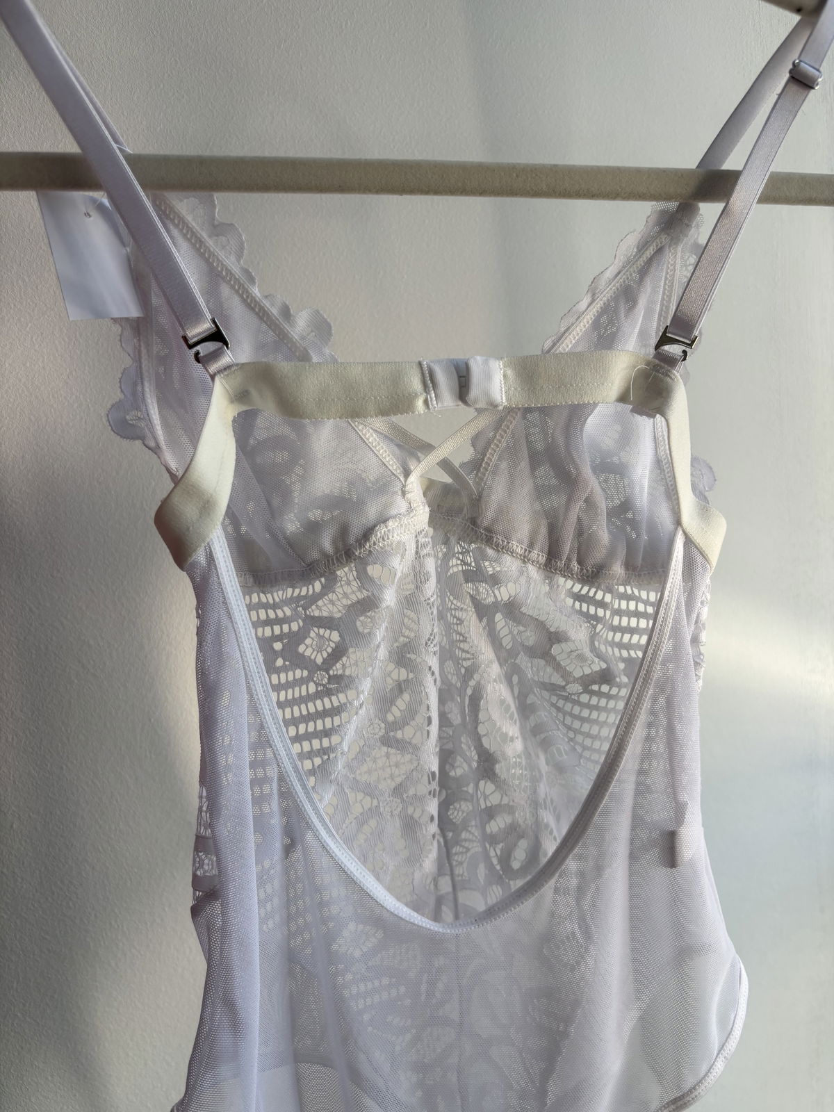 Este body de encaje con tazas forradas en microtul es perfecto para sentirte cómoda y sexy toda la noche. Las tiras cruzadas en el frente le dan un toque moderno y súper canchero.