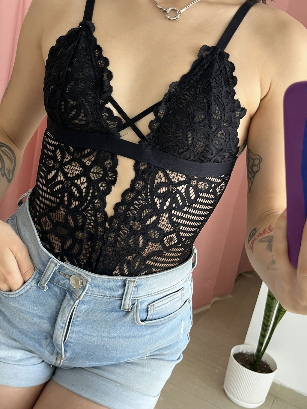 Este body de encaje con tazas forradas en microtul es perfecto para sentirte cómoda y sexy toda la noche. Las tiras cruzadas en el frente le dan un toque moderno y súper canchero.